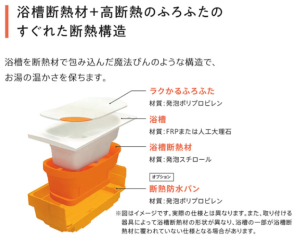 LIXILの「サーモバスS」やTOTOの「魔法びん浴槽」など、時間が経ってもお湯が冷めにくい構造の浴槽があります。