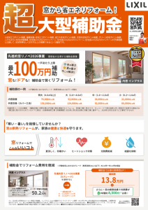 これは、省エネ効果が見込まれる内窓リフォームや水廻りリフォーム工事を行った際に、国から補助金がでます。既存住宅の省エネ化を国が本格的にサポートする施策となっています。