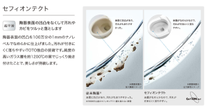 TOTOのセフィオンテクトの陶器表面は、ナノレベルで凹凸がありません。また、汚れがつきにくく、落ちやすいという特徴があります。