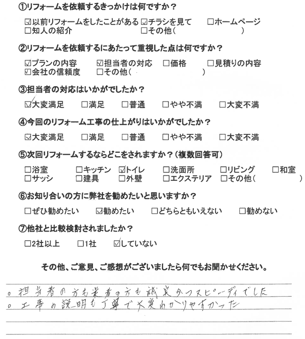 外壁塗装・トイレ・洗面・台所(水栓)のリフォームをお願いしましたが、約3週間の工事の工程表を事前に受取り説明を受けたので、安心してお任せすることができました。