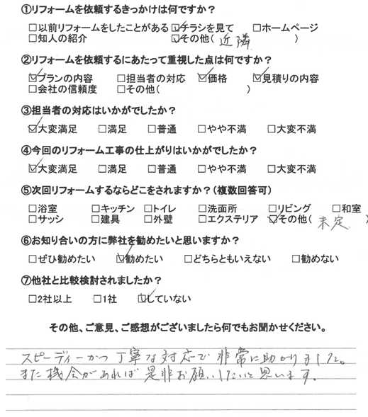 もうほとんどのリフォームは終わりましたけど、何か直したい所が発生したら、その時はぜひ貴社にお願いしたいと考えております。