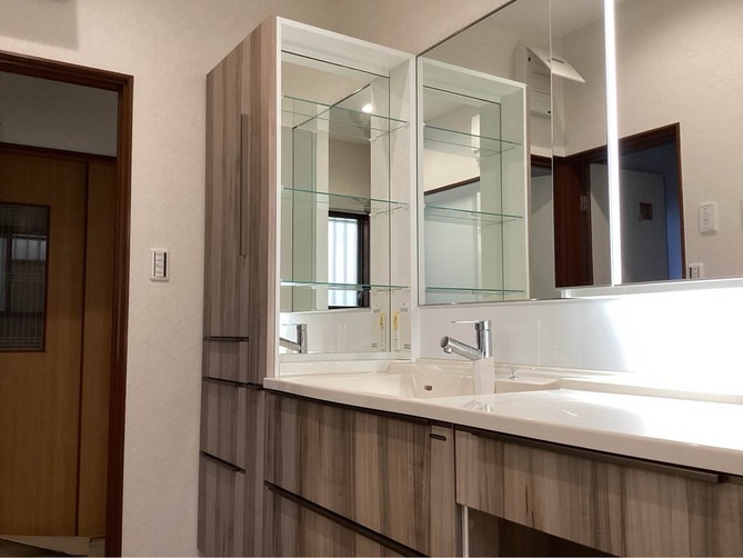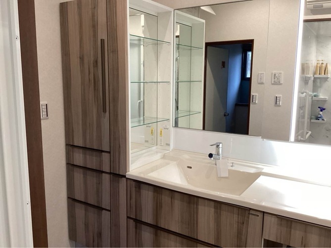収納部の充実させ、タオルや洗面用品をスッキリ収納可能。使いやすさと収納力を両立しています。