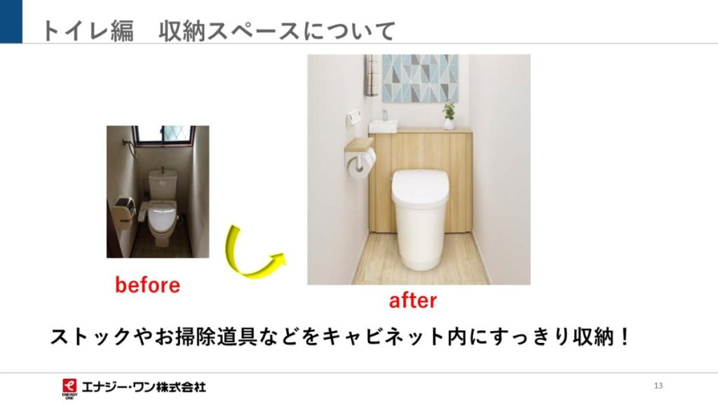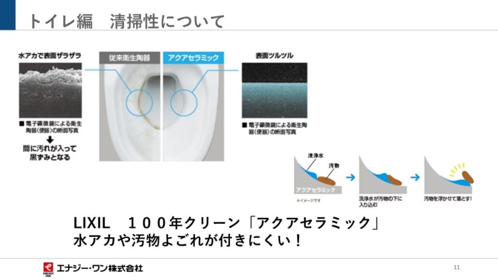 - ・リクシル製の「リフォレ」という商品は、見た目もスッキリでお掃除用具なども収納でき、機能もグレードもお客様のご要望に沿った商品をご提案させて頂きました。また、リクシル製の便器は100年クリーン「アクアセラミック」といって、従来の衛生陶器では出来なかった「ガンコな水アカ」も「汚物」もどちらも落とせる、お掃除ラクラクな衛生陶器です。
